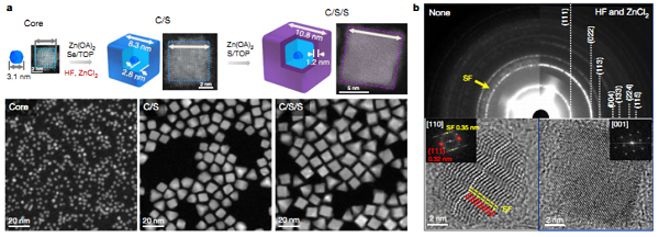 光學(xué)超表面開(kāi)始進(jìn)入集成設(shè)備,可以增強(qiáng)和控制光波的發(fā)射、調(diào)制、動(dòng)態(tài)整形和檢測(cè)。在這項(xiàng)研究中,三星先進(jìn)技術(shù)研究院&斯坦福大學(xué)發(fā)現(xiàn)有機(jī)發(fā)光二極管(OLED)顯示器的體系結(jié)構(gòu)可以通過(guò)引入納米圖案的超表面反射鏡而完全重新設(shè)想。 在最終的meta-OLED顯示器中,不同的metasurface圖案定義了紅色,綠色和藍(lán)色像素,并確保從有機(jī)白色發(fā)光體中優(yōu)化提取這些顏色。這種新的體系結(jié)構(gòu)有助于創(chuàng)建使用可縮放納米壓印光刻技術(shù)的新興顯示應(yīng)用(例如增強(qiáng)現(xiàn)實(shí))所需的超高像素密度(每英寸> 10000像素)的設(shè)備。相對(duì)于標(biāo)準(zhǔn)的彩色濾光白色OLED,所制造的像素還具有兩倍的發(fā)光效率和出色的色純度。Metasurface-driven OLED displays beyond 10000 pixels per inch.(Science, 2020, DOI:10.1126/science.abc8530)2.三星先進(jìn)技術(shù)研究院Nature:高效穩(wěn)定的藍(lán)色量子點(diǎn)發(fā)光二極管