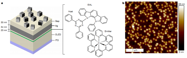 使用量子點(diǎn)對(duì)精確的顏色信息進(jìn)行可視化已經(jīng)探索了數(shù)十年,并且采用環(huán)保材料的商業(yè)產(chǎn)品目前可以用作背光源。然而,基于量子點(diǎn)的下一代電致發(fā)光顯示器需要開(kāi)發(fā)有效且穩(wěn)定的無(wú)鎘的藍(lán)光發(fā)射裝置,由于藍(lán)光發(fā)射材料的光物理性能較差,這仍然是一個(gè)挑戰(zhàn)。三星先進(jìn)技術(shù)研究院介紹了ZnSe基藍(lán)色發(fā)光量子點(diǎn)的合成。作者發(fā)現(xiàn)氫氟酸和氯化鋅添加劑可通過(guò)消除ZnSe晶體結(jié)構(gòu)中的堆垛層錯(cuò)而有效提高發(fā)光效率。另外,通過(guò)液體或固體配體交換的氯化物鈍化導(dǎo)致緩慢的輻射復(fù)合,高的熱穩(wěn)定性和有效的電荷傳輸性質(zhì)。文章在發(fā)光二極管中構(gòu)造了具有梯度氯化物含量的雙量子點(diǎn)發(fā)射層,以促進(jìn)空穴傳輸,并且所得器件在理論極限下顯示出效率,高亮度和長(zhǎng)使用壽命。作者認(rèn)為高效、穩(wěn)定的藍(lán)色量子點(diǎn)發(fā)光器件可以促進(jìn)使用量子點(diǎn)的電致發(fā)光全色顯示器的開(kāi)發(fā)。Efficient and stable blue quantum dot light-emitting diode.(Nature, 2020, DOI:10.1038/s41586-020-2791-x)3.UDC Nature:等離子增強(qiáng)有機(jī)發(fā)光器件的穩(wěn)定性和亮度