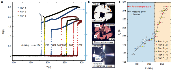 超薄二維(2D)半導(dǎo)體層狀材料為擴(kuò)展摩爾定律在集成電路中的晶體管數(shù)量提供了巨大的潛力。2D半導(dǎo)體的一個(gè)主要挑戰(zhàn)是避免從相鄰的電介質(zhì)形成電荷散射和捕獲位點(diǎn)。六方氮化硼(hBN)的絕緣范德華層提供了出色的界面電介質(zhì),有效地減少了電荷散射。最近的研究表明,在熔融金表面或塊狀銅箔上單晶hBN薄膜的生長(zhǎng)。然而,由于熔融金的高成本,交叉污染以及過(guò)程控制和可擴(kuò)展性的潛在問(wèn)題,因此不被工業(yè)所青睞。銅箔可能適用于卷對(duì)卷工藝,但不太可能與晶圓上的先進(jìn)微電子制造兼容。因此,可靠的直接在晶圓上生長(zhǎng)單晶hBN薄膜的方法將有助于在工業(yè)中廣泛采用2D層狀材料。先前在Cu(111)金屬上生長(zhǎng)hBN單層的嘗試未能實(shí)現(xiàn)單取向,當(dāng)這些層合并成flms時(shí)會(huì)導(dǎo)致有害的晶界。人們甚至認(rèn)為從理論上講,在諸如Cu(111)這樣的高對(duì)稱性表面上生長(zhǎng)單晶hBN是不可能的。臺(tái)積電&臺(tái)灣陽(yáng)明交通大學(xué)&萊斯大學(xué)報(bào)道了在兩英寸c面藍(lán)寶石晶片上的Cu(111)薄膜上成功完成了單晶hBN單層的外延生長(zhǎng)。第一性原理計(jì)算結(jié)果證實(shí)了這一令人驚訝的結(jié)果,這表明通過(guò)hBN橫向?qū)又罜u(111)步驟可增強(qiáng)外延生長(zhǎng),從而確保hBN單層的單向性。所獲得的單晶hBN在底柵結(jié)構(gòu)中作為二硫化鉬和二氧化鉿之間的界面層并入,提高了晶體管的電性能。這種生產(chǎn)晶圓級(jí)單晶hBN的可靠方法為將來(lái)的2D電子學(xué)鋪平了道路。Wafer-scale single-crystal hexagonal boron nitride monolayers on Cu (111).(Nature, 2020, DOI:10.1038/s41586-020-2009-2)5.羅徹斯特大學(xué)&英特爾:氫化碳硫中的室溫超導(dǎo)