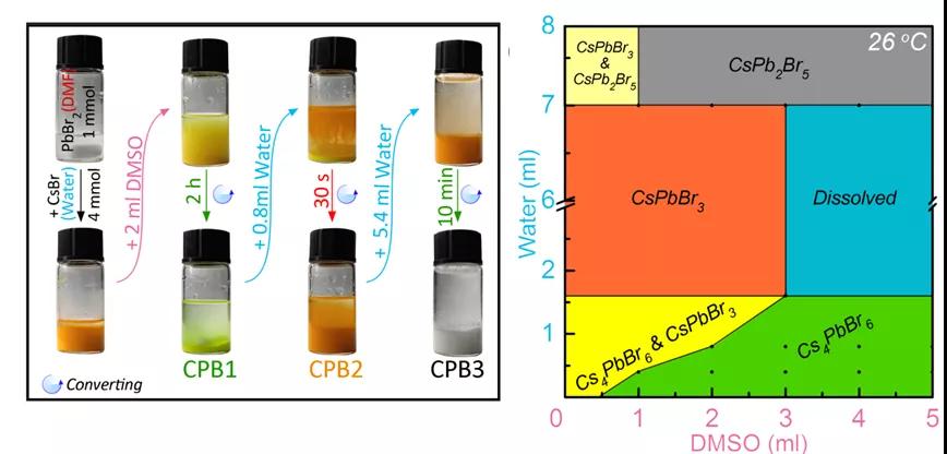 圖2. 三溶劑體系中水和DMSO量控制的銫鉛溴鈣鈦礦各相之間的互相轉(zhuǎn)化,以及室溫下隨水和DMSO相轉(zhuǎn)變的相圖。圖中CPB1,CPB2和CPB3分別為Cs4PbBr6,CsPbBr3和CsPb2Br5。