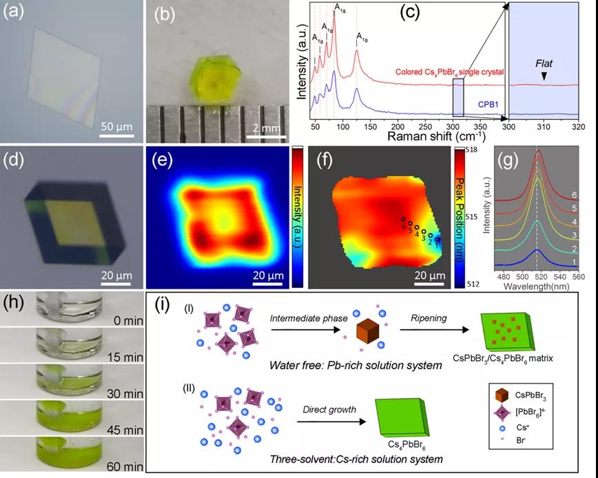 圖3. a,b 三溶劑體系適用于合成不同尺寸,厚度的Cs4PbBr6晶體。c,拉曼測(cè)試證實(shí)所制備晶體內(nèi)部不存在CsPbBr3內(nèi)嵌雜質(zhì)。d,e,f,g Cs4PbBr6晶體的熒光Mapping測(cè)試,其發(fā)光存在幾何依賴的特點(diǎn)。h,i 三溶劑體系可以直接析出Cs4PbBr6晶體而不經(jīng)歷CsPbBr3中間相,因而,所獲得的體相晶體中避免了CsPbBr3雜質(zhì)的出現(xiàn)。
