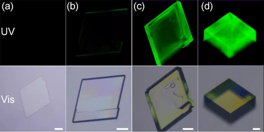 圖4. 限域法制備的不同厚度的Cs4PbBr6晶體,圖例為15微米。晶體隨著厚度的增加,逐步從發(fā)光轉(zhuǎn)變?yōu)槿l(fā)光。