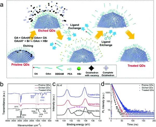 近日,北京科技大學(xué)田建軍教授(通訊作者)團(tuán)隊(duì)設(shè)計(jì)了一種新型的酸蝕驅(qū)動(dòng)的配體交換策略,獲得了超低缺陷態(tài)密度和高穩(wěn)定性的純藍(lán)光(465 nm)、小尺寸(≈4nm)CsPbBr3鈣鈦礦量子點(diǎn)(QDs)。該策略是先使用酸溴化氫(HBr)來(lái)蝕刻不完美的[PbBr6]4-八面體,從而去除表面缺陷和過(guò)多的羧酸鹽配體。再先后引入十二烷基胺和苯乙胺來(lái)鍵合QDs剩余未配位的位點(diǎn),并與原有長(zhǎng)鏈有機(jī)配體進(jìn)行原位交換,從而達(dá)到97%的量子熒光產(chǎn)率,而且其穩(wěn)定性得到顯著提高。基于該QDs的PeLEDs表現(xiàn)出純藍(lán)光的電致發(fā)光(470 nm)和EQE為4.7%。而且,其亮度為3850 cd m-2,這是迄今為止報(bào)道的純藍(lán)光PeLEDs的最高亮度。此外,該P(yáng)eLEDs還表現(xiàn)出強(qiáng)大的耐久性,在連續(xù)工作的情況下,半衰期超過(guò)12小時(shí),這也是藍(lán)光PeLEDs當(dāng)前報(bào)道的最高值。該成果以題為“Perovskite Quantum Dots with Ultralow Trap Density by Acid Etching-Driven Ligand Exchange for High Luminance and Stable Pure-Blue Light-Emitting Diodes”發(fā)表在了Adv. Mater.上。