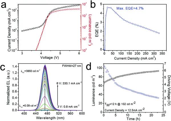 這項(xiàng)工作將酸蝕和配體交換結(jié)合起來(lái),制備出高質(zhì)量的純藍(lán)色發(fā)光鈣鈦礦CsPbBr3 QDs。強(qiáng)酸性HBr蝕刻了具有空位缺陷的不完美八面體,并從QDs中去除多余的羧酸鹽配體。然后,通過(guò)短支鏈DDDAM鏈和PEA物種之間的配體交換過(guò)程,隨后與QDs表面形成強(qiáng)的L型配位作用。這一策略顯著提高了QDs的穩(wěn)定性,消除大量缺陷,獲得97%的量子熒光產(chǎn)率?;谠換Ds的PeLEDs表現(xiàn)出純藍(lán)光發(fā)射(470nm)和4.7%的EQE,符合NTSC和Rec.2020標(biāo)準(zhǔn),是一種理想的藍(lán)光發(fā)射。3850cd m-2的亮度和12小時(shí)的半衰期也是迄今為止所報(bào)道的純藍(lán)光PeLEDs的最高亮度和穩(wěn)定性表現(xiàn)。因此,這一策略為推動(dòng)PeLEDs的發(fā)展和應(yīng)用提供了一種途徑。