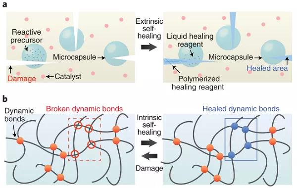 自修復(fù)材料可大致分為兩類:外源型(圖1a)和內(nèi)源型(圖1b)。當(dāng)分散的愈合劑(通常由聚合物基質(zhì)中的反應(yīng)性前驅(qū)物和催化劑組成)在損傷后釋放時(shí),會發(fā)生外源型自修復(fù)。這些愈合劑可以通過自主聚合反應(yīng)和交聯(lián)網(wǎng)絡(luò)的重建來修復(fù)損傷區(qū)域。盡管這種方法非??煽浚辉试S材料有限次數(shù)愈合,而且通常不能在相同的位置重復(fù)愈合。相比之下,內(nèi)源型自修復(fù)材料不需要添加愈合劑,并且受損區(qū)域能夠通過聚合物基質(zhì)的重組重復(fù)愈合。此過程是通過動態(tài)共價(jià)鍵或非共價(jià)鍵的再生以及受損界面上聚合物鏈的纏繞重建了基體。