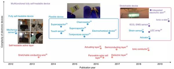 圖3. 具有自修復(fù)功能的柔性電子設(shè)備。最近報(bào)道的基于出版年份和電子設(shè)備復(fù)雜性的自修復(fù)柔性電子設(shè)備。紅色指可自我修復(fù)的活性層;藍(lán)色指獨(dú)立的可自我修復(fù)的電子設(shè)備;紫色指多功能可自我修復(fù)的可拉伸系統(tǒng)。