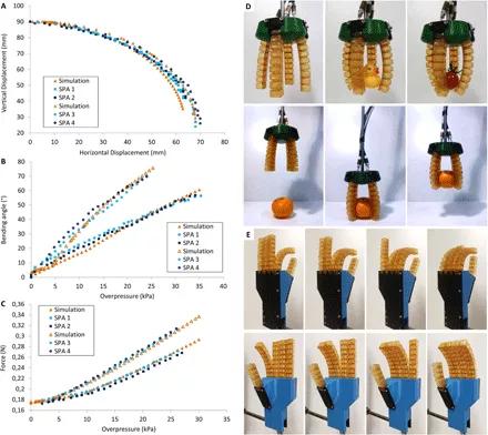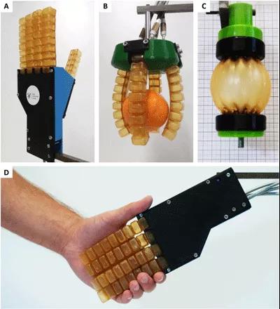 圖5. 軟氣動執(zhí)行器。(A和D)自修復(fù)軟氣動手。 (B)自修復(fù)軟氣動抓手。 (C)自修復(fù)等褶狀氣動人工肌肉。