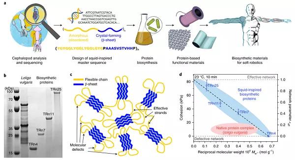 圖 7. 蛋白鏈結(jié)構(gòu)及其高級折疊結(jié)構(gòu)。魷魚蛋白質(zhì)的分析,魷魚啟發(fā)的主序列的設(shè)計(jì)以及蛋白質(zhì)庫的生物合成,產(chǎn)生了基于蛋白質(zhì)的功能性自修復(fù)材料,適用于軟促動器和機(jī)器人應(yīng)用。b,天然Loligo vulgaris蛋白復(fù)合物和生物合成TRn4,TRn7,TRn11和TRn25多肽的蛋白大小。c,生物合成串聯(lián)重復(fù)多肽的納米結(jié)構(gòu)由通過柔性鏈(黃色)連接的β-片狀納米晶體網(wǎng)絡(luò)(藍(lán)色)組成,具有分子缺陷(懸空的末端和環(huán))。d,由于優(yōu)化的網(wǎng)絡(luò)形態(tài),魷魚啟發(fā)的蛋白質(zhì)(在室溫下)的自愈特性比天然蛋白質(zhì)得到的改善。誤差線,標(biāo)準(zhǔn)偏差(n = 5)。
