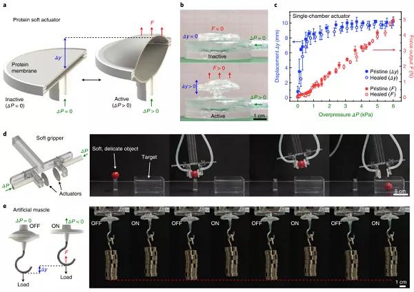 當(dāng)前的自修復(fù)材料具有限制其實(shí)際應(yīng)用的缺點(diǎn),例如低的治療強(qiáng)度(低于兆帕)和長的治療時(shí)間(小時(shí))。 針對這個(gè)問題德國馬普研究所的Melik C. Demirel和來自美國賓州州立大學(xué)的Metin Sitti團(tuán)隊(duì)基于魷魚腕足吸盤中的環(huán)狀齒蛋白序列,通過蛋白質(zhì)工程技術(shù),成功制備出了兼具高愈合后強(qiáng)度、超快愈合速度(愈合后強(qiáng)度達(dá)到2-23 MPa,愈合時(shí)間1s)和生物可降解的自愈合彈性體材料,并將這種材料用于制備氣動人工肌肉和柔性抓手。這種材料可以在一秒鐘內(nèi)通過局部加熱自我修復(fù)微觀和宏觀機(jī)械損傷。并且經(jīng)過系統(tǒng)優(yōu)化,可以改善其氫鍵結(jié)合的納米結(jié)構(gòu)和網(wǎng)絡(luò)形態(tài),具有可編程的愈合特性,超過其他天然和合成軟材料的數(shù)量級。