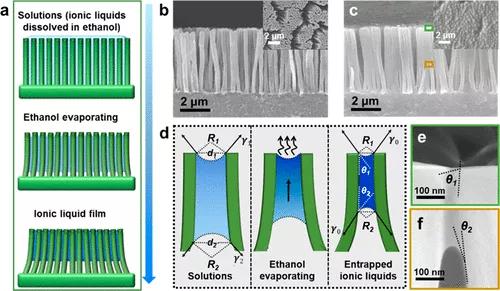 圖9. 基于液膜的超耐用應(yīng)變傳感器的制造。(a)液膜的形成過程。(b,c)分別具有和不具有離子液體膜的微絨毛的橫截面SEM圖像。插圖:頂視圖SEM圖像。(d)分析驅(qū)動力。(e,f)液膜頂部和底部的彎液面夾在微絨毛之間。