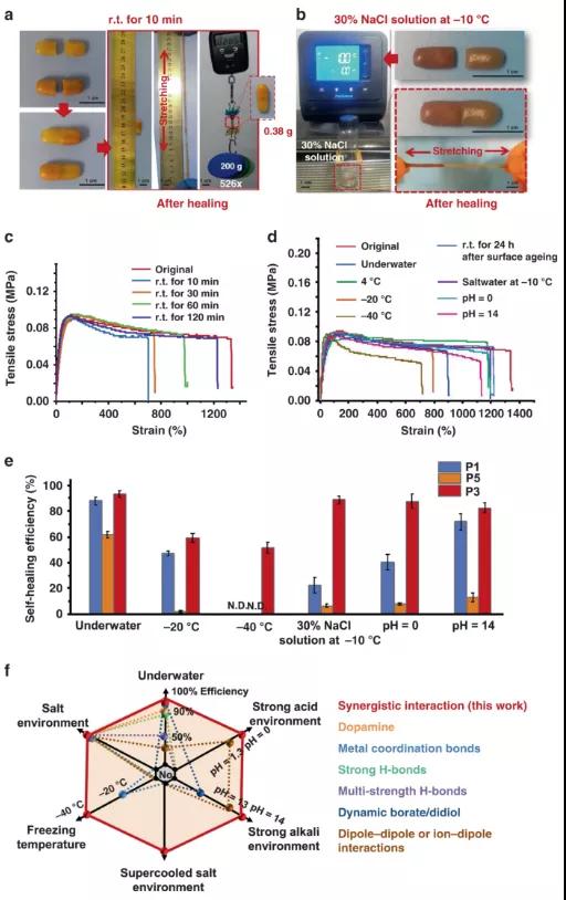 皮膚和肌肉在受到損傷時(shí)會自動自我修復(fù),而這一能力一直是科學(xué)家夢寐以求想賦予材料的一種特殊性能。然而,目前的可修復(fù)材料的大多數(shù)設(shè)計(jì)都需要外部能量才能愈合或者這些材料的機(jī)械強(qiáng)度較弱。動態(tài)超分子材料可以在一定程度上解決以上問題,它在室溫下無需外部條件便可以發(fā)生自我修復(fù)。但是,具有自修復(fù)性能的動態(tài)超分子材料往往不能適用于極端條件,原因在于:(i)當(dāng)可修復(fù)材料在水下受傷或破裂時(shí),水分子會干擾動態(tài)鍵的重新連接,導(dǎo)致材料無法修復(fù)。(ii)在凍結(jié)條件下,可修復(fù)材料中鍵的動態(tài)特性遇到很大的障礙,從而極大地限制了自修復(fù)過程。(iii)一些自我修復(fù)的相互作用易受pH值變化的影響。針對以上問題,來自天津大學(xué)化工學(xué)院張雷教授團(tuán)隊(duì),通過在聚二甲基硅氧烷聚合物中協(xié)同結(jié)合多強(qiáng)度氫鍵和二硫鍵交換,設(shè)計(jì)出一種具有普遍自愈性和高拉伸性的超分子彈性體。它可以在極端條件下實(shí)現(xiàn)快速的自主自修復(fù),包括在室溫、超低溫(?40°C)、水下、過冷的高濃度鹽水(-10°C下30%NaCl溶液中)和強(qiáng)酸/堿環(huán)境(pH=0或14)。這些性質(zhì)歸因于動態(tài)強(qiáng)氫鍵和弱氫鍵與強(qiáng)二硫鍵的協(xié)同相互作用。