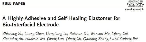 柔性可拉伸電極在可穿戴電子領(lǐng)域中具有廣泛的應(yīng)用。近年來,隨著醫(yī)療器械的發(fā)展,人們對可拉伸電極材料的功能性要求也越來越高。如用于監(jiān)測生物電信號的電極材料不僅需要優(yōu)異的彈性和導(dǎo)電性,還需要和生物界面具有優(yōu)異的粘附性來保證信號的穩(wěn)定性。目前所采用的電極所采用的基體材料通常采用硅橡膠類彈性體,這類聚合物在具有高彈性的時(shí)候并不能具備粘附性。因此制備一種本身具有粘性的彈性體具有重要的意義。針對這一問題,南京大學(xué)化學(xué)化工學(xué)院張秋紅副教授、賈敘東教授課題組將帶有二羥基的多巴胺基團(tuán)引入到以聚四氫呋喃醚基聚氨酯體系中,利用體系內(nèi)的動態(tài)氫鍵和多巴胺間相互作用,制備了一種新型的“粘”彈體(斷裂形變5100%,斷裂強(qiáng)度1.9 MPa,粘附強(qiáng)度62 kPa)。