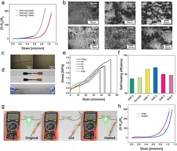 圖13. 自修復(fù)性能測試。a)自我修復(fù)過程。b)拉伸前后自我修復(fù)的多氫鍵彈性體的照片。c)原始,第一,第二,第三和第四愈合的多氫鍵彈性體的典型應(yīng)力-應(yīng)變曲線和d)韌性。e)比較不同自修復(fù)聚合物彈性體的機(jī)械自修復(fù)效率。f)25和30 LBL循環(huán)的應(yīng)變傳感器的電氣自修復(fù)性能。g)電氣自我修復(fù)過程。h)帶有25個(gè)LBL循環(huán)的已修復(fù)傳感器的SEM圖像。