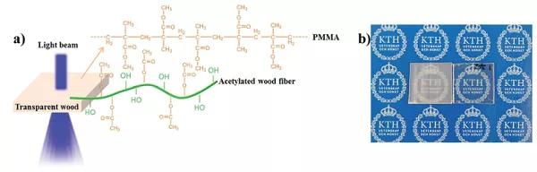 圖2 (a)改性高透明木材結(jié)構(gòu)的示意圖;(b)非乙?;该髂静?左)和乙?;该髂静?右)。