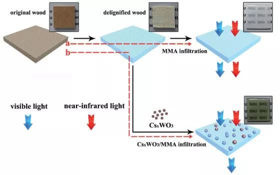 https://chemistry-europe.onlinelibrary.wiley.com/doi/full/10.1002/cssc.2018018263. J. Mater. Chem. A.: 用于隔熱窗應(yīng)用的含納米CsxWO3的透明木材上海大學(xué)Yanfeng Gao團(tuán)隊(duì)將納米粒子分散在預(yù)聚合的甲基丙烯酸甲酯中,然后填充到脫木質(zhì)素木材的納米孔中,制備透明木材。該木質(zhì)復(fù)合材料表現(xiàn)出優(yōu)異的近紅外(NIR,范圍從780到2500 nm)屏蔽能力和高可見(jiàn)光透明度。CsxWO3/透明木材也表現(xiàn)出優(yōu)異的機(jī)械性能,斷裂強(qiáng)度高達(dá)59.8 MPa,模量高達(dá)2.72 GPa。CsxWO3/透明木材有望成為智能窗應(yīng)用的潛在材料。