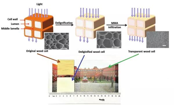 透明木材是一種多功能木質(zhì)復(fù)合材料,關(guān)于透明木材的第一份報(bào)道來(lái)源于Fink公司于1992年編寫(xiě)的木材形態(tài)學(xué)研究。后來(lái),通過(guò)將機(jī)械性能與光學(xué)透射率研究相結(jié)合,提出了透明木材在工程相關(guān)領(lǐng)域的應(yīng)用。由于在基本木材特性基礎(chǔ)上增加了光學(xué)透射率,透明木材有助于木材解剖學(xué)研究,還可用于透光智能建筑、電子設(shè)備,以及光伏電池和光源等光子設(shè)備。