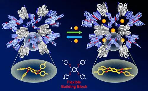 三維共價有機框架(3D COFs)的構建是非常困難的,因為它們的合成驅動力主要來自共價鍵的形成。為了便于合成,剛性結構單元始終是設計3D COFs的首選。原則上,用柔性的單元構建3D COFs應該很有吸引力,但是此類系統(tǒng)的發(fā)展遇到了瓶頸,尤其是在設計合成和結構確定方面。這項成果報道了一種新型的高度結晶的3D COF (FCOF-5),在結構基元主鏈中具有柔性的C–O單鍵。有趣的是,F(xiàn)COF-5是柔性的,在蒸汽吸附/解吸時發(fā)生可逆的膨脹/收縮,表明存在呼吸運動。進一步制備了一種具有FCOF-5結構的智能軟聚合物復合膜,該復合膜具有可逆的蒸汽觸發(fā)相變。因此,由柔性單元構建的3D COFs可以表現(xiàn)出有趣的呼吸行為,這種柔性多孔晶體將具有多種有趣特性。
