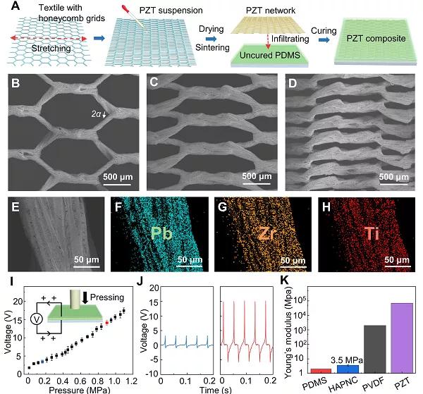 圖2. A 柔性壓電復(fù)合材料的制備示意圖。B-D 不同預(yù)拉伸的壓電陶瓷骨架電鏡圖。E-H 陶瓷骨架能譜圖。I-J不同壓力下的電壓輸出。K 不同材料的楊氏模量對(duì)比。