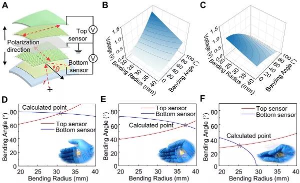 圖3. A 彎曲模式下壓電輸出示意圖。B 仿真應(yīng)變分布圖。C 仿真各向異性。D 不同彎曲方向的電壓輸出信號(hào)。E 不同彎曲方向和彎曲幅度的電壓輸出。F 多種各向異性傳感器的對(duì)比。