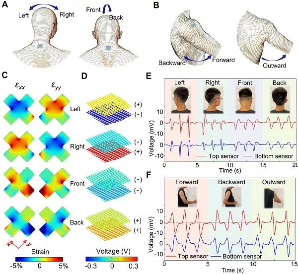 圖 5. A 頸椎運(yùn)動(dòng)模式示意圖。B 肩關(guān)節(jié)運(yùn)動(dòng)模式示意圖。C-D 仿真應(yīng)變和電壓分布。E 不同頸椎運(yùn)動(dòng)對(duì)應(yīng)的傳感器信號(hào)。F 不同肩關(guān)節(jié)運(yùn)動(dòng)對(duì)應(yīng)的傳感器信號(hào)。