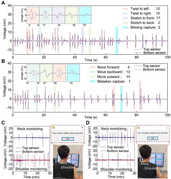 研究人員進(jìn)一步將具有兩層壓電復(fù)合材料的傳感器貼到人的手掌上,便可通過(guò)分析上下兩層傳感器的壓電輸出,解耦得到手掌的彎曲幅度和彎曲方向(如圖4所示)。另一方面,當(dāng)這種傳感器被貼到頸椎和肩關(guān)節(jié)上時(shí),上下兩層傳感器傳出的不同信號(hào)也能被用來(lái)分析頸椎和肩關(guān)節(jié)的運(yùn)動(dòng)模式,比如判斷頸椎是左右扭動(dòng)還是前后擺動(dòng)(如圖5所示)。在此基礎(chǔ)上,研究人員建立了一套關(guān)節(jié)運(yùn)動(dòng)監(jiān)測(cè)和警報(bào)系統(tǒng),在半個(gè)小時(shí)的監(jiān)測(cè)中,這套系統(tǒng)不光能判斷人體頸椎和肩關(guān)節(jié)的運(yùn)動(dòng)情況,而且還能根據(jù)不同情況對(duì)哪些部位缺乏運(yùn)動(dòng)進(jìn)行警告,從而避免長(zhǎng)時(shí)間久坐帶來(lái)的各種關(guān)鍵疾?。ㄈ鐖D6所示)。
