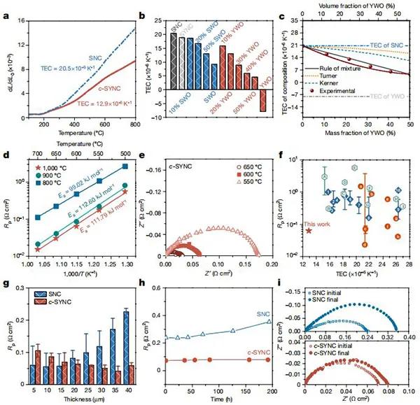 (a)c-SYNC和SNC在100至800℃的空氣中的熱膨脹曲線;(b)SNC,SYNC,x wt%SWO-SNC和x wt%YWO-SNC組成的TECs,質(zhì)量百分比x在0到100之間變化;(d)在800、900和1000℃燒制的c-SYNC電極的極化電阻;(e)在500、600和650℃下c-SYNC電極的阻抗譜;(f)在600℃條件下,各種ORE材料的RP與TEC的匯總圖;(g)基于c-SYNC和SNC的對稱電池的ASR值與電極厚度的函數(shù)關(guān)系;(h)40μm厚c-SYNC和SNC對稱電池在600℃的空氣中測量200小時的Rp;(i)耐久性試驗前后c-SYNC和SNC電極的EIS圖。