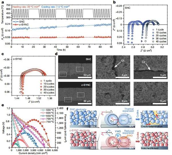 (a)基于SNC和c-SYNC的對稱電池電極在600℃到300℃之間的40個熱循環(huán)中的ASR(RP)響應(yīng)(在最低30℃ min-1的加熱速率和大約最低7.5℃ min-1的被動冷卻下90小時的總累計試驗);(b,c)循環(huán)后SNC(b)和c-SYNC(c)對稱電池的代表性EIS曲線;(e)有40μm厚c-SYNC陰極的陽極支撐的H2/空氣SOFC的I-V和I-P(I,電流密度;V,電壓;P,功率密度)曲線;(f)提出了在c-SYNC復(fù)合電極TEC補償熱機(jī)械增強的機(jī)理,并對粒子相互作用和力的分析進(jìn)行了放大,對比了SNC與c-SYNC的行為。 文章轉(zhuǎn)載自微信公眾號:材料人