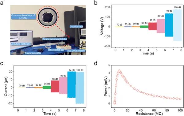 低頻聲能在學(xué)術(shù)領(lǐng)域和工業(yè)界都受到了極大的關(guān)注。在我們的生活環(huán)境中,低頻聲波波長較長,不易被吸收或隔離。但是,這種機械能如果采用適當(dāng)?shù)钠骷O(shè)計和能量轉(zhuǎn)換方法,如壓電法和電磁法,可以將其采集并轉(zhuǎn)化為電能,有望實現(xiàn)對電子器件的供電。對于壓電器件,通常采用高壓電系數(shù)的陶瓷材料,但其與空氣的阻抗不匹配極大影響了聲電轉(zhuǎn)換效能的提升。對于電磁方式,通常需要線圈、磁鐵等笨重的部件,不利于微弱環(huán)境聲能量采集系統(tǒng)的實現(xiàn)。近年來,王中林院士提出的新型摩擦納米發(fā)電機(TENG)在聲能采集領(lǐng)域顯示出廣闊的前景。與壓電聲學(xué)器件相比,TENG器件常具有軟、柔性的特點,可以顯著降低能量采集器與入射聲波之間的聲阻抗失配,以提高聲能量收集裝置的輸出功率。此外,摩擦電器件具有廣泛的材料選擇性,給器件的制作及實現(xiàn)帶來了極大便利。到目前為止,已經(jīng)有幾項研究顯示了TENG在聲波能量收集和自供電傳感方面的潛力。上述器件主要采用實現(xiàn)聲壓增強的亥姆霍茲聲諧振器。然而,當(dāng)亥姆霍茲諧振腔底部采用柔性膜時,往往會出現(xiàn)聲壓放大效果的降低。此外,基于亥姆霍茲諧振器的聲能采集器對柔性部件的變化非常敏感,這表明要實現(xiàn)最優(yōu)性能,需要復(fù)雜的調(diào)試工程。實際上,四分之一波長諧振器是另一種重要的聲學(xué)諧振器,與亥姆霍茲諧振器相比,它具有設(shè)計簡單、制作方便等獨特的優(yōu)點。但這種結(jié)構(gòu)在聲學(xué)TENG領(lǐng)域還沒有得到足夠的重視。此外,對于聲摩擦納米發(fā)電器件,其關(guān)鍵部件之一是用于聲波傳播的穿孔板。在以往的研究中,這一層通常由多孔材料組成,如微穿孔鋁、導(dǎo)電織物、泡沫銅等。然而,這些材料的孔徑很難調(diào)控,粘滯損失對聲衰減的影響也沒有進行探討,對孔的加工工序也較復(fù)雜。針對上述問題,近日,在南京郵電大學(xué)謝燕楠教授和袁明副教授研究團隊,提出了一種3D打印的聲學(xué)摩擦納米發(fā)電機(A-TENG),具有結(jié)構(gòu)可控、一次性成型、制作簡單、成本低等特點。通過四分之一波長管優(yōu)異的放大性能及器件參數(shù)的合理設(shè)計,該系統(tǒng)在100 dB聲壓級激勵下能夠產(chǎn)生4.33 mW的峰值功率輸出,實現(xiàn)對72個LED的驅(qū)動。當(dāng)聲壓級為90分貝時,即可驅(qū)動一個商用計算器連續(xù)工作,表明其作為低功耗電子設(shè)備電源的應(yīng)用前景。此外,團隊還開發(fā)了由A-TENG、AI語音識別芯片和控制電路組成的智能邊緣系統(tǒng)。語音信號首先可以通過A-TENG轉(zhuǎn)化為電信號,然后由內(nèi)置預(yù)訓(xùn)練的AI芯片進行邊緣識別和處理,產(chǎn)生相應(yīng)的指令動作來控制后續(xù)電路。該智能邊緣系統(tǒng)無需云計算即可實現(xiàn)實時語音識別,展示了聲學(xué)TENG在低功耗、高性價比的物聯(lián)網(wǎng)領(lǐng)域的巨大潛力。該成果以題為“A 3D-printed acoustic triboelectric nanogenerator for quarter-wavelength acoustic energy harvesting and self-powered edge sensing”發(fā)表在Nano Energy上(IF 16.602)。圖1 四分之一波長聲能采集系統(tǒng)的示意圖