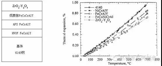 有的多層結(jié)構(gòu)通過(guò)采用多種成分涂層來(lái)滿足一種性能要求,例如,為了開(kāi)發(fā)出能夠滿足柴油發(fā)動(dòng)機(jī)用的長(zhǎng)壽命厚熱障涂層,Robert等采用了熱膨脹系數(shù)非常接近的三層結(jié)合底層來(lái)降低涂層熱應(yīng)力,其涂層結(jié)構(gòu)如圖所示,各層涂層的熱膨脹行為如右圖所示。由于基體材料4140、NiCrAlY、FeCrAlY、FeCoNiCrAl和ZrO2-Y2O3之間膨脹系數(shù)屬于逐漸變化的,從而可以大幅度減小ZrO2-Y2O3涂層與基體之間的熱膨脹不匹配性,從而達(dá)到減小熱應(yīng)力、延長(zhǎng)使用壽命的目的。