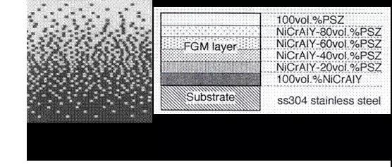 在熱障涂層中,由于粘結(jié)層金屬和氧化鋯陶瓷的熱膨脹系數(shù)差異較大,這種差異將導(dǎo)致涂層內(nèi)應(yīng)力過(guò)大,并且在熱循環(huán)條件下常發(fā)生陶瓷涂層的早期破壞。為了減小內(nèi)應(yīng)力,提高涂層與基體的結(jié)合強(qiáng)度,材料科學(xué)家開(kāi)始在常規(guī)熱障涂層中引入功能梯度材料制備技術(shù)。