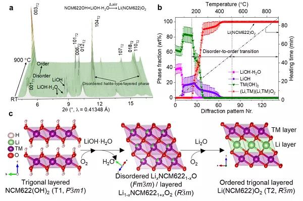圖1 a氫氧化物前驅(qū)體Ni0.6Co0.2Mn0.2(OH)2和一水合氫氧化鋰的變溫同步輻射衍射圖;b 物相組成隨溫度變化圖;c 高溫固相反應(yīng)所對應(yīng)的結(jié)構(gòu)衍變機理圖。