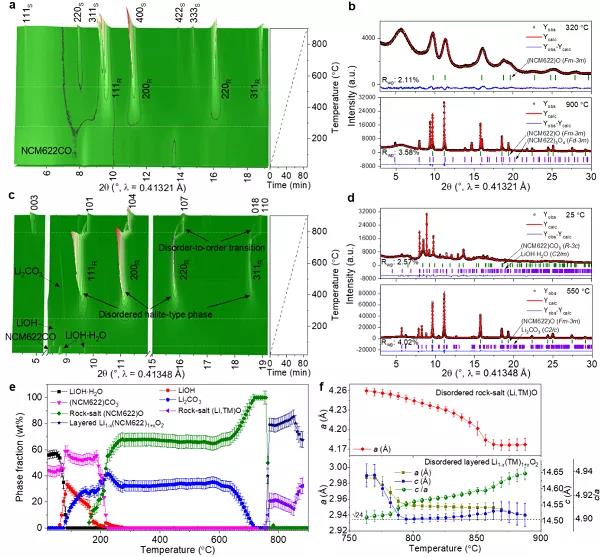 圖2 a 碳酸鹽前驅(qū)體Ni0.6Co0.2Mn0.2CO3的變溫同步輻射衍射圖及b 加熱至320 °C和900 °C時的Rietveld精修圖;c Ni0.6Co0.2Mn0.2CO3和LiOH·H2O的變溫同步輻射衍射圖及d 在室溫25 °C和加熱至550 °C時的Rietveld精修圖;e 混合物加熱過程中物相組成變化圖;f 無序巖鹽結(jié)構(gòu)(Fmm)和有序?qū)訝罱Y(jié)構(gòu)(Rm)加熱過程中的晶胞參數(shù)變化曲線。