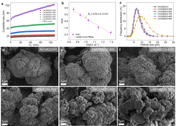 圖5高溫晶體生長動力學(xué)研究:a 晶粒尺寸在不同溫度下隨燒結(jié)時間的變化;b 晶粒生長動力學(xué)活化能計算圖;前驅(qū)體及不同溫度煅燒下c 粒徑分布圖和d-i 掃描電子顯微鏡圖。