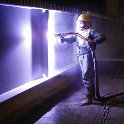 筆者建議金屬熱噴涂必須選擇干噴砂進行表面處理,磨料粒徑最好選擇0.5-2㎜冷激鋼砂。粒度配合是0.5-1㎜約占30%,1-2㎜約占40%-50%,粗磨料約占10%-15%之間。噴槍嘴徑大約在8-12㎜,除銹等級符合GB8923標準中的Sa2.5級,表面粗糙度RZ(50-80)μm。根據(jù)干噴砂對于鋼鐵表面活化能及防止二次返銹,干噴砂后按照國標4h、ISO 8h內(nèi)必須進行金屬熱噴涂。