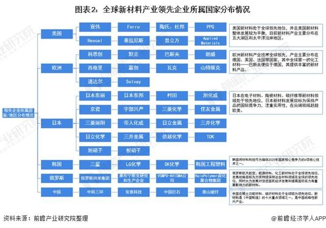 目前,美國、日本和歐洲等地區(qū)在經(jīng)濟實力、核心技術、研發(fā)能力、市場占有率等方面占據(jù)絕對優(yōu)勢,擁有成熟的新材料市場,多數(shù)產(chǎn)品占據(jù)全球市場的壟斷地位,是新材料產(chǎn)業(yè)主要的創(chuàng)新主體。陶氏、杜邦、康寧、3M、帝人、東麗、東洋紡、巴斯夫、贏創(chuàng)、索爾維、帝斯曼等跨國巨頭早已形成壟斷。這些大型跨國公司無論在經(jīng)濟實力、核心技術還是在研發(fā)能力、市場占有率等多方面占據(jù)絕對優(yōu)勢,并通過持續(xù)創(chuàng)新在高技術含量、高附加值的新材料市場中保持著主導地位。技術領域全面領跑的國家是美國,日本的優(yōu)勢在化工新材料、電子信息材料、高分子材料等領域,歐洲則在結構材料、光學與光電材料、生態(tài)環(huán)境材料等方面。