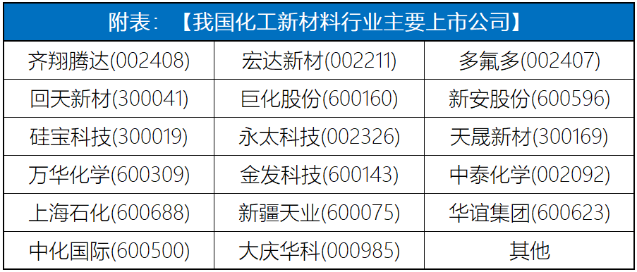 以化工新材料為例,“十三五”期間,行業(yè)得以快速發(fā)展,部分行業(yè)短板得到補足。當前中國化工新材料市場呈現(xiàn)總體競爭格局松弛與局部龍頭壟斷并行的局面,未來行業(yè)發(fā)展區(qū)域化趨勢仍將持續(xù)。當前形成局部壟斷的化工新材料主要以大型國有企業(yè)為主,少量中石化集團所屬的中小型國有企業(yè)表現(xiàn)不俗,數(shù)十家上市企業(yè)競相發(fā)展(附上市公司清單)。這些企業(yè)因其進入時間較早、積累了一定的行業(yè)經(jīng)驗、形成完整的產(chǎn)業(yè)基礎、裝置、技術、人才儲備充分,同時也具有完整的產(chǎn)品鏈及管理規(guī)范。