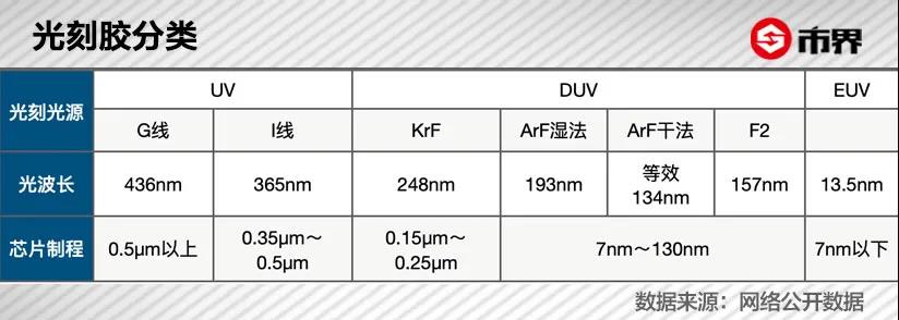 一定程度上來說,光刻出的電路圖案越精密,就代表著芯片性能越好。采用不同的光刻光線,對(duì)應(yīng)地需要搭配不同的光刻膠。目前,根據(jù)不同的光波長,光刻膠大致可以分為G線、I線、KrF、ArF、EUV這幾類。