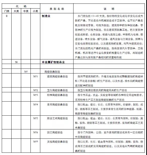 下表中節(jié)選了中國國標分類表中的部分條目,例如大類30為非金屬礦物制品業(yè),其中類307為陶瓷制品制造,第四級小類分類3071到3079為陶瓷制品下屬的子類。從小類3071到3076分為為:建筑陶瓷制品制造,衛(wèi)生陶瓷制品制造;特種陶瓷制品制造;日用陶瓷制品制造;陳設(shè)藝術(shù)陶瓷制造。不容易歸類的統(tǒng)一劃到小類3079其他陶瓷制品。