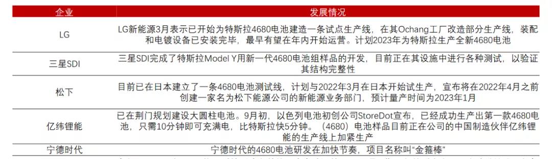 映射到圓柱電池上面,在主流車企幾乎均選擇方形或軟包方案的背景下,逐漸沒落的圓柱電池有希望憑借4680方案的實現(xiàn)迎來第二春。如今,海內(nèi)外的主流動力電池企業(yè)正在加快布局4680圓柱電池的建設(shè)腳步,提前搶占技術(shù)高地。