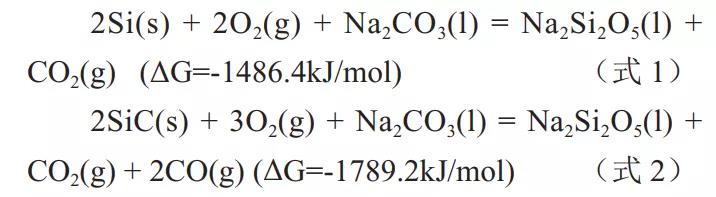 從式 1-4 可以看出,在腐蝕過程中,陶瓷中的 SiC 和 Si 相均可以與 Na2CO3 和 Na2SO4 熔鹽發(fā)生化學(xué)反應(yīng)。從在反應(yīng)溫度的吉布斯自由能 (ΔG)比較可以發(fā)現(xiàn), Na2SO4 更容易對(duì) SiC 和 Si 相造成腐蝕, 使得試樣表面的粗糙度相對(duì)較大??涛g后SiC 陶瓷表面存在 Na2Si2O5 等雜質(zhì)相, 可能降低硅涂層與基體的結(jié)合強(qiáng)度。因此, 在噴涂前將經(jīng)熔鹽腐蝕的試樣放在 20% 氫氟酸中進(jìn)行超聲波震蕩除去鹽層,并用蒸餾水沖洗干凈, 放入烘箱內(nèi)烘干處理, 然后進(jìn)行噴涂實(shí)驗(yàn)。