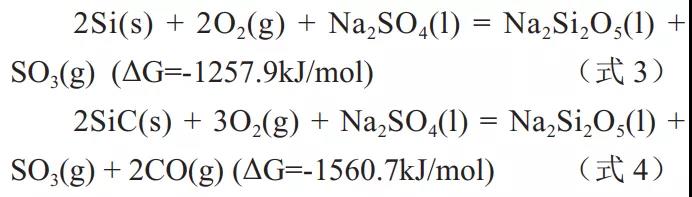 圖 2 為在 900℃ Na2CO3 和 Na2SO4 熔鹽中處理 4 h 的 SiC 陶瓷的 XRD 圖譜??梢钥闯觯?兩種熔鹽腐蝕后, SiC 陶瓷的相組成是相同的, 主要是由 SiC 和 Si 以及少量 Na2Si2O5 組成。其中,Na2SO4 熔鹽腐蝕樣品的硅含量明顯多于 Na2CO3熔鹽腐蝕樣品的硅含量。SiC 陶瓷中的 Si 相主要來源于其制備過程中填充到孔隙的游離硅 。熔鹽腐蝕過程中, 可能發(fā)生的化學(xué)反應(yīng)包括: