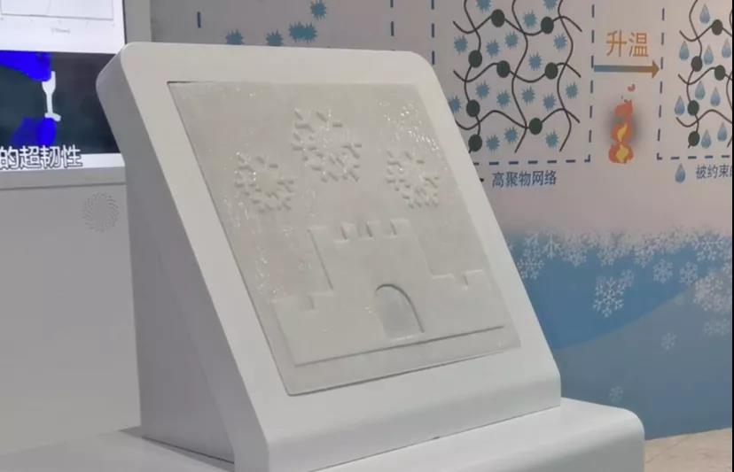 給水凝膠加上一層自制冷裝置,就能做出冰板、冰墻。升溫時(shí)水不滴落,可以用于制作精美浮雕——這是世界上現(xiàn)有的唯一可長(zhǎng)期在冰上保存浮雕的技術(shù)方案。在科技館中展出的冰板上,就雕刻著“城樓”和“雪花”。雖然摸的人不少,但圖案的形狀一直保持清晰。