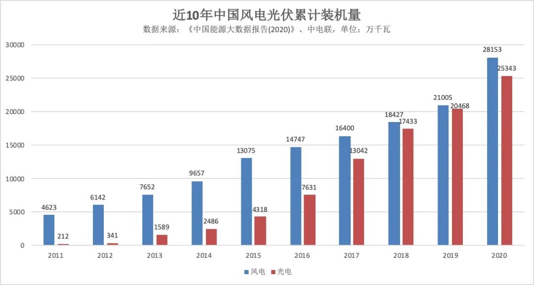 風(fēng)電、光伏產(chǎn)業(yè)對未來十年年均新增裝機規(guī)模預(yù)測分別為5000萬-6000萬千瓦和7000萬-9000萬千瓦。這一預(yù)測下,屆時新能源裝機規(guī)模將大大超過12億千瓦的國家承諾下限,達到17億千瓦以上。增速也將顯著超過“十三五”時期。過去5年,風(fēng)電年均新增約3000萬千瓦(其中2020年新增超過7000萬千瓦),光伏年均新增約5000萬千瓦。即便是第三方機構(gòu),給出的風(fēng)光合計年均裝機預(yù)測也普遍達到1億千瓦以上。