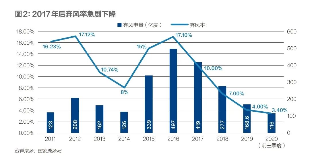 棄風(fēng)棄光一度是困擾中國新能源發(fā)展的關(guān)鍵問題,2016年前后,部分省份棄風(fēng)率一度超過30%,2017年之后雖然迅速緩解,但在未來更高比例的新能源裝機下,消納隱憂依然揮之不去。