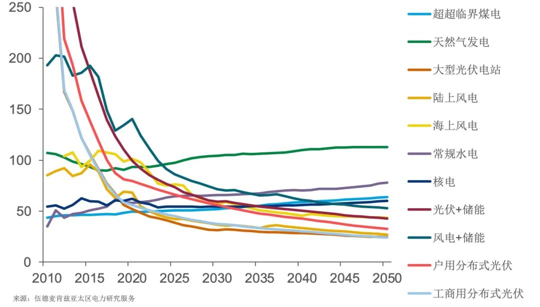 據(jù)國際能源咨詢公司伍德麥肯茲近期發(fā)布的報告,未來十年,火電的成本還將上升,光伏、風(fēng)電則有40%—50%的成本下降空間。2035年是一個分水嶺,屆時中國所有可再生能源發(fā)電的成本都將比煤電低。如果再加上為碳排放支付的費用,煤電成本將高出10%—15%。