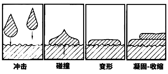 具有一定溫度和速度的噴涂粒子在接觸基體材料的瞬間,以一定的動能沖擊基體材料表面,產生強烈的碰撞。在碰撞基體材料的瞬間,噴涂粒子的動能轉化為熱能并傳遞給基體材料,在凹凸不平的基材表面上產生形變。由于熱傳遞的作用,變形粒子迅速冷凝并伴隨著體積收縮,其中大部分粒子呈扁平狀牢固地粘結在基體材料表面上,而另一小部分碰撞后經基體反彈而離開基體表面。隨著噴涂粒子束不斷地沖擊碰撞基體表面,碰撞一變形—冷凝收縮一填充連續(xù)進行。變形粒子在基體材料表面上,以顆粒與顆粒之間相互交錯疊加地粘結在一起,而最終沉積形成涂層。