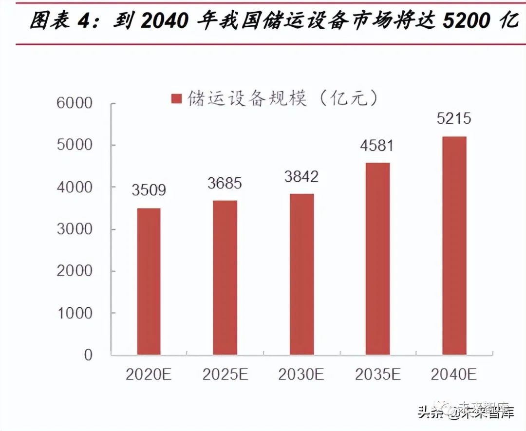 龐大的氫能需求需依靠完善的氫儲運供應(yīng)鏈,將帶來千億級設(shè)備投資規(guī)模。在 氫能行業(yè)深度報告系列二中,我們詳盡分析了氫能在工業(yè)、交通、建筑等領(lǐng)域參與深 度脫碳的潛力,即在 2060 碳中和目標(biāo)下,據(jù)中國氫能聯(lián)盟預(yù)測,到2040 年,我國 氫氣的年需求量將增至 5700 萬噸左右,龐大的氫能需求量需依靠完善的氫儲運供應(yīng) 鏈。假設(shè)按照終端氫氣售價 30 元/kg,儲運成本占比 30%,設(shè)備投資成本占比 70%, 對應(yīng)儲運設(shè)備市場規(guī)模將達(dá) 5200 億元。