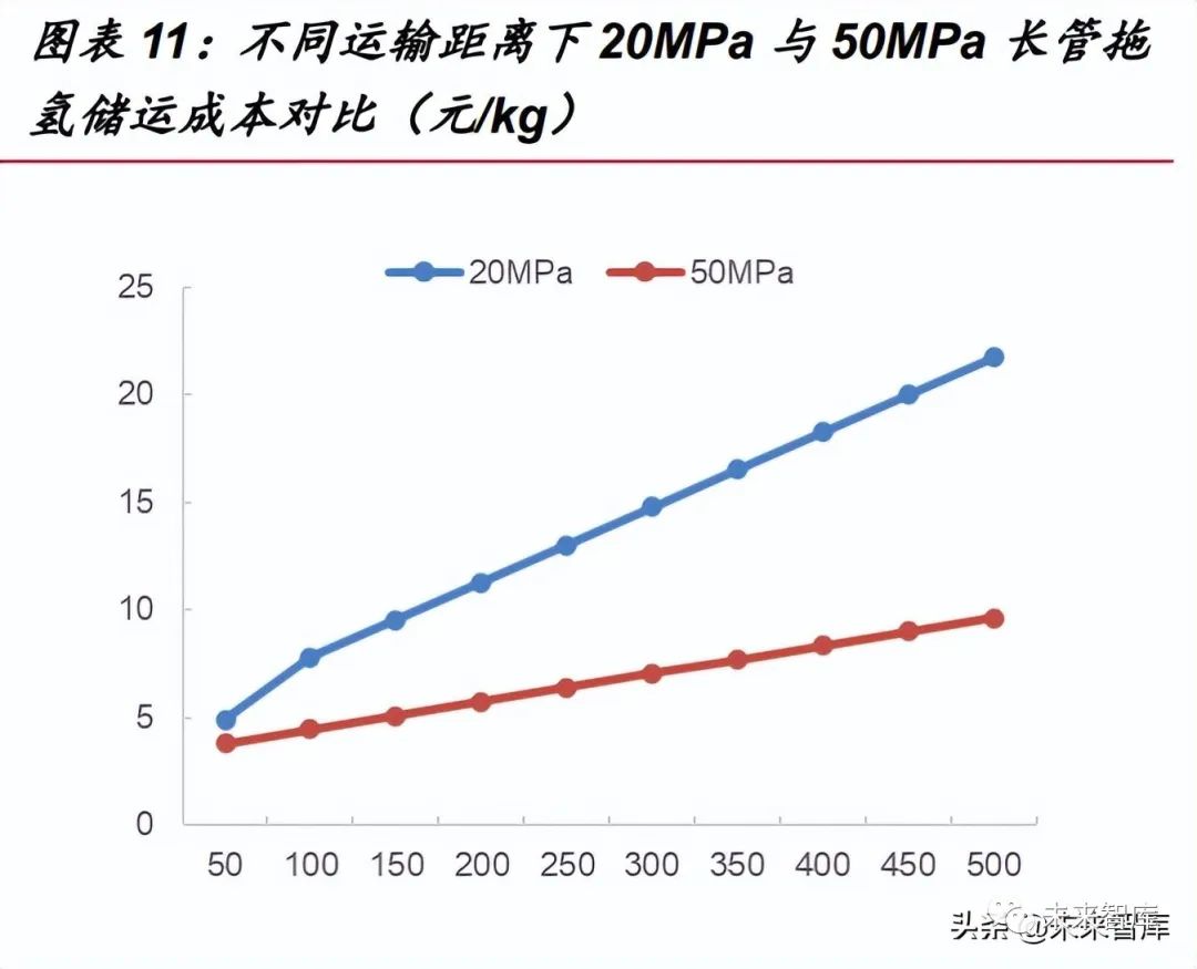 據(jù)中石油化工研究院數(shù)據(jù),當(dāng)運輸距離為 50km 時,氫氣的運輸成本為 4.9 元/kg; 隨著運輸距離的增加,長管拖車運輸成本逐漸上升,當(dāng)距離 500km 時運輸成本近 22 元/kg,所以考慮到經(jīng)濟(jì)性問題,長管拖車運氫一般適用于 200km 內(nèi)的短距離和運量 較少的運輸場景。此外可以看出,隨著距離增加,20MPa 和 50MPa 運輸條件下的成 本逐漸分化,50MPa 下的成本優(yōu)勢越來越明顯,當(dāng)運輸距離為 200km 時,其成本差 距約 4 元/kg。實際上,超過 200km 的運輸距離將導(dǎo)致拖車及人員配置冗雜的問題。