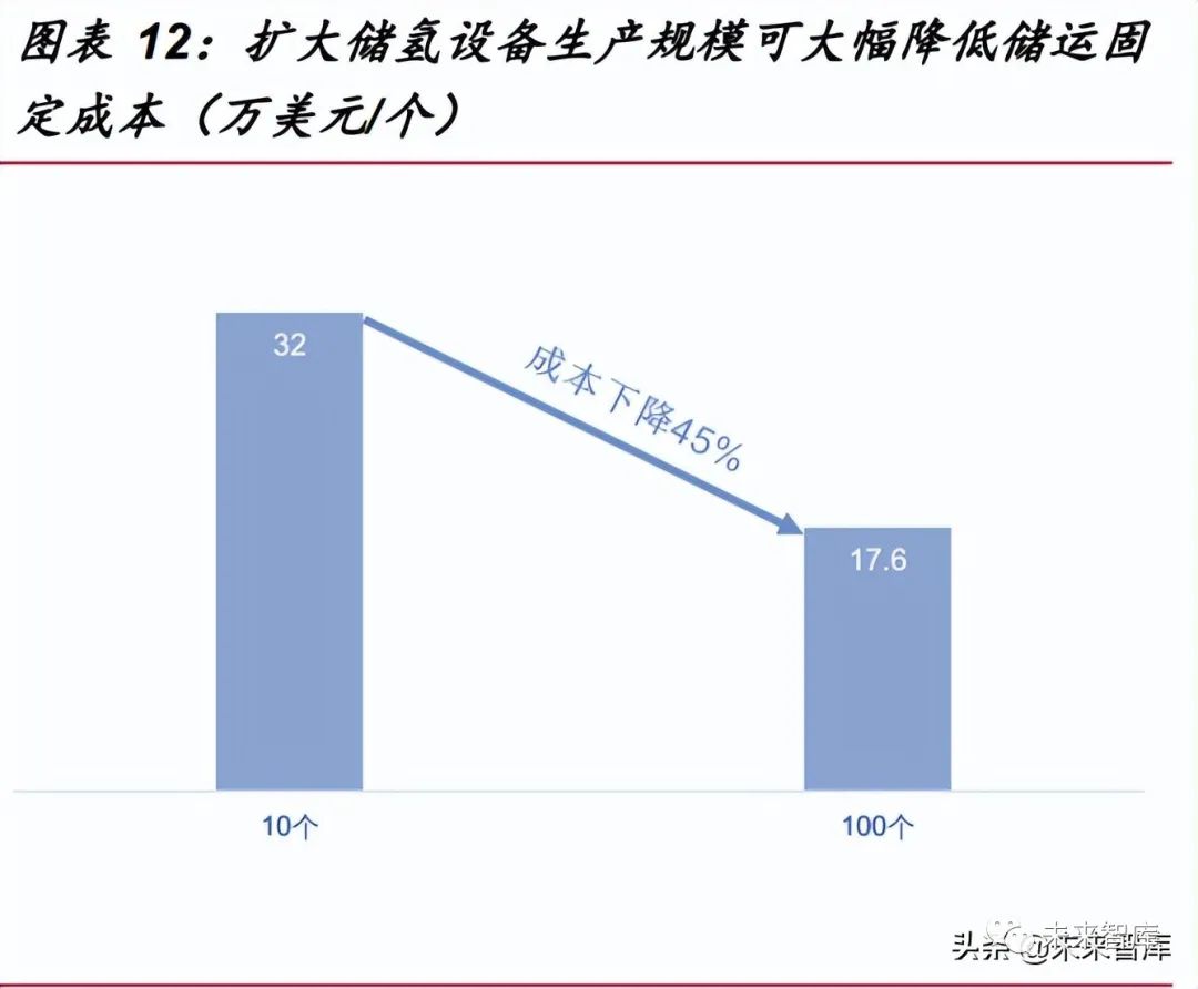未來長管拖氫儲運成本下降的有效路徑是:一方面可通過提高儲氫壓力,實現(xiàn)儲 氫密度和運輸效率都更高的氫氣儲運方式;另一方面,未來氫氣氣態(tài)儲運成本下降的 有效路徑是擴大相關(guān)設(shè)備生產(chǎn)量。單位成本將在規(guī)模效應(yīng)下逐步下降。據(jù) NREL (National Renewable Energy Laboratory)預(yù)測,當(dāng)儲氫容器需求量從 10 增加到 100 個時,儲氫容器成本可下降約 45%。