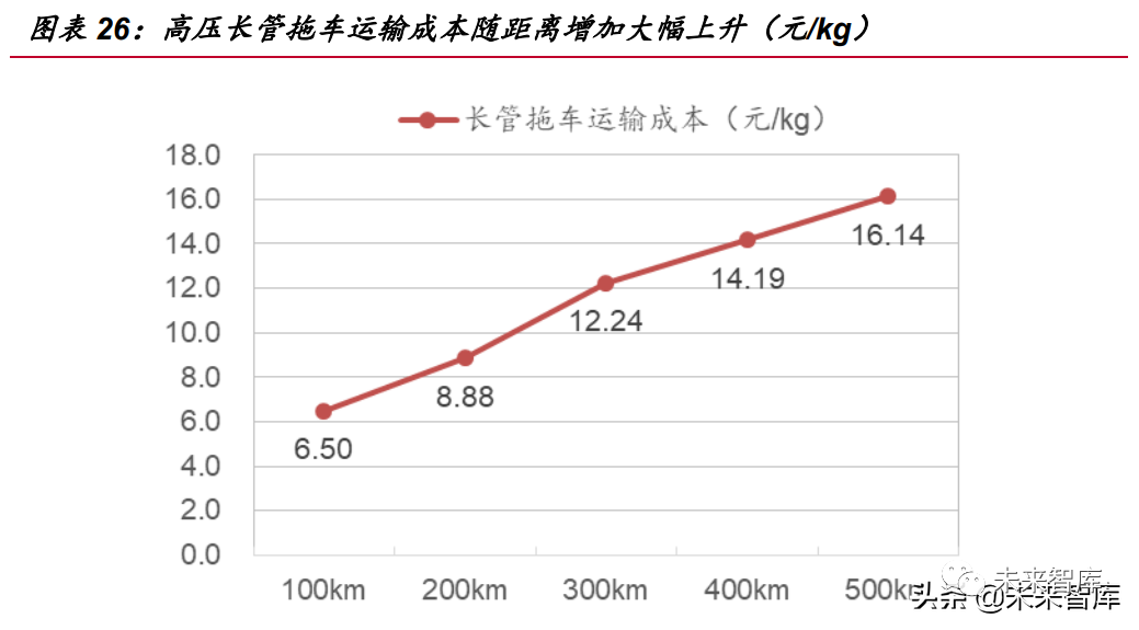 高壓長管拖車運輸成本隨距離增加大幅上升。根據(jù)以上假設(shè),可測算出規(guī)模為 500kg/d、距離氫源點 100km 的加氫站,運氫成本為 6.50 元/kg。隨著運輸距離的增 加,長管拖車運輸成本逐漸上升。距離 500km 時運輸成本達(dá)到 16.14 元/kg(注:當(dāng) 輸送距離超過 200km 后,單輛拖車已無法實現(xiàn)當(dāng)日往返多次來滿足用氫需求,超過 200km 后,我們以多輛拖車同時運輸來計算)。因此,考慮到經(jīng)濟(jì)性問題,長管拖